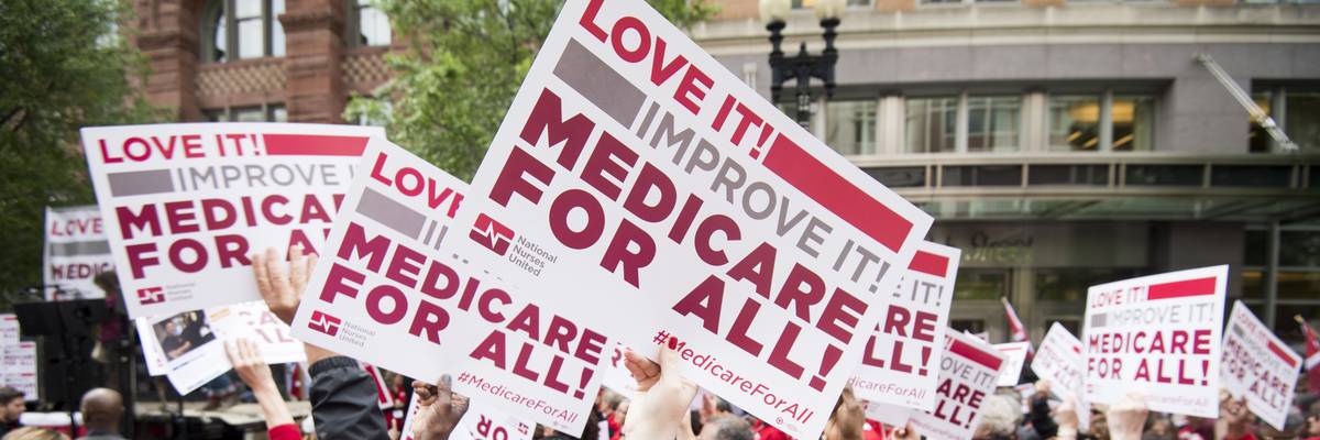 Members of National Nurses United union members wave “Medicare for All” signs during a rally in front of the Pharmaceutical Research and Manufacturers of America in Washington calling for “Medicare for All”