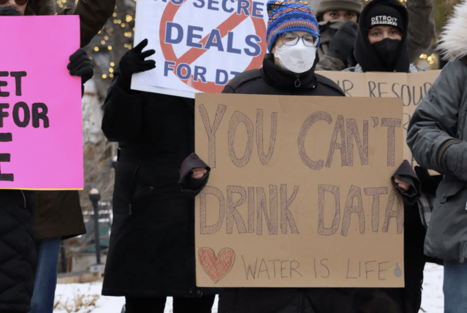 Protesters gather outside DTE Energy headquarters in downtown Detroit during the “No Data Centers, No Secret Deals” demonstration, opposing a proposed massive data center in Saline Township, Michigan. Around 100 people attended the rally, holding signs reading “You Can’t Drink Data” and “No Secret Deals for Data” to raise concerns about water use, transparency, and public accountability in the project. Photo credit: Valerie Jean, December 16, 2025.
