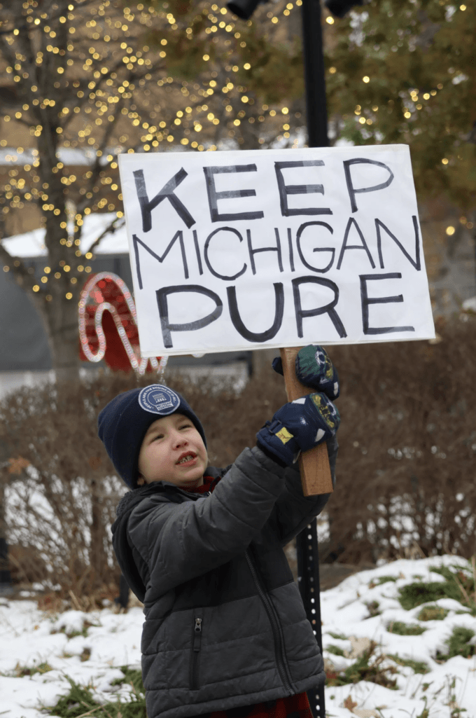 A young demonstrator holds a sign reading “Keep Michigan Pure” during the “No Data Centers, No Secret Deals” protest. The rally brought together residents concerned about environmental protections, water resources, and government transparency. Photo credit: Valerie Jean, December 16, 2025.