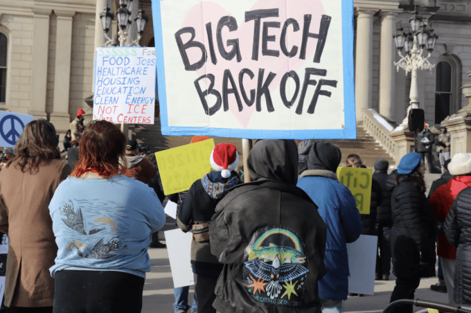 Protesters gather outside the Michigan State Capitol during the “No Data Centers, No Secret Deals” demonstration, holding signs that read “Big Tech Back Off.” Participants called for public investment in essential services and greater transparency in development decisions. Photo credit: Valerie Jean, December 16, 2025.