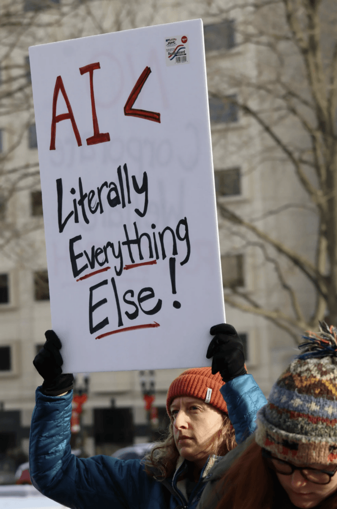 A protester holds a sign reading “AI < Literally Everything Else!” during the “No Data Centers, No Secret Deals” demonstration outside the Michigan State Capitol. Participants voiced concerns about prioritizing artificial intelligence infrastructure over community needs and public resources. Photo credit: Valerie Jean, December 16, 2025.