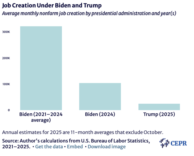 In the last year of the Biden presidency, the economy created just over 1.2 million jobs, an average of over 100,000 a month. In the year from January 2025 to January of 2026 (the survey for the January jobs report is done before the 20th and therefore the month is attributed to Biden), the economy created 290,000 jobs, or an average of 24,000 a month.