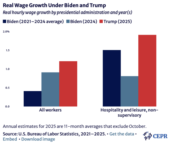 In 2025, the real wage for all workers grew 1.2 percent. For production and non-supervisory workers in the leisure and hospitality sector it grew 1.9 percent. The faster rate of growth for workers in this low-paid sector is somewhat surprising since it goes along with many indications of labor market weakness, like falling quit rates and a sharp rise in unemployment for young and Black workers.