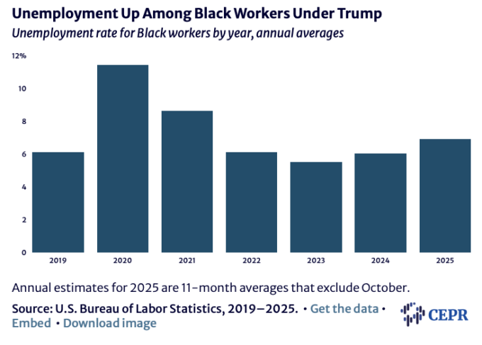 As the labor market weakened some in 2024, the unemployment rate for Black workers rose. It averaged 6.0 percent for the last year of the Biden administration, compared to an average of 6.5 percent over the full four years. The unemployment for Black workers has risen rapidly in 2025, hitting 8.3 percent in November. It has averaged 6.9 percent in the year from January 2025 to January 2026.