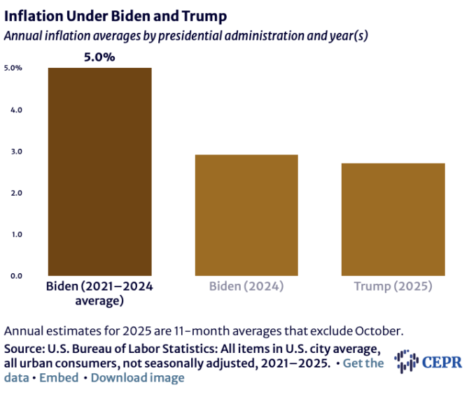 The annualized inflation rate from January 2025 to January 2026 was 2.7 percent, almost exactly the same as the 3.0 percent rate for the last year of the Biden administration. This compares to an average rate of 5.0 percent over Biden’s four-year term.