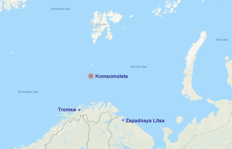 The Komsomolets was on a training mission to the waters where the shallow Barents Sea meets the deeper Norwegian Sea when it on April 7, 1989, sank after a fire. The submarine had Zapadnaya Litsa on the Kola Peninsula as home port. Map: Google Map / Barents Observer