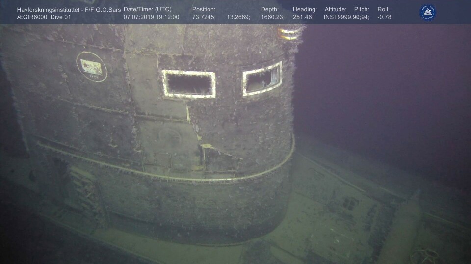 The submarine, which contains one nuclear reactor and two plutonium warheads, lies on the seafloor approximately 250 kilometres southwest of Bear Island. Since its sinking on 7 April 1989, there have been concerns that radioactive leakage could affect the marine environment.