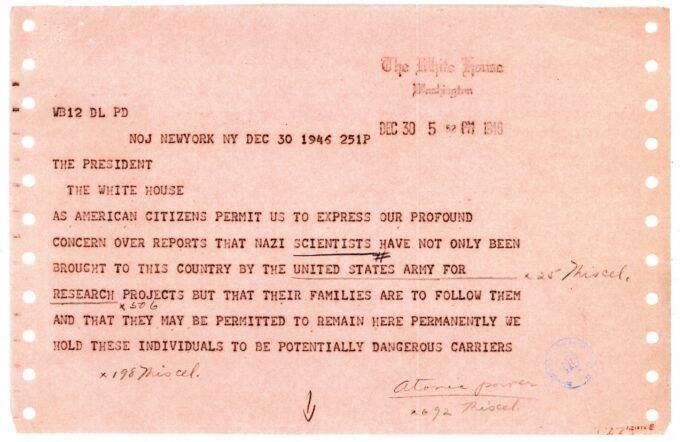 First page of a telegram denouncing the recruitment of Nazi scientists under Operation Paperclip sent to President Harry S. Truman on December 30, 1946 by the Council Against Intolerance in America, signed by Albert Einstein and others.