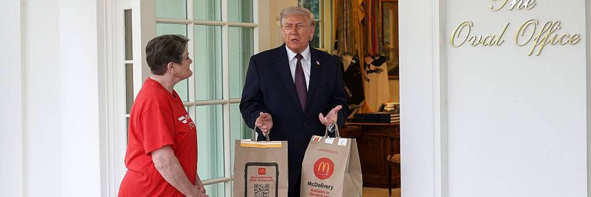 President Donald Trump receives a DoorDash delivery of McDonald’s from Sharon Simmons outside the Oval Office of the White House on April 13, 2026 in Washington, DC.