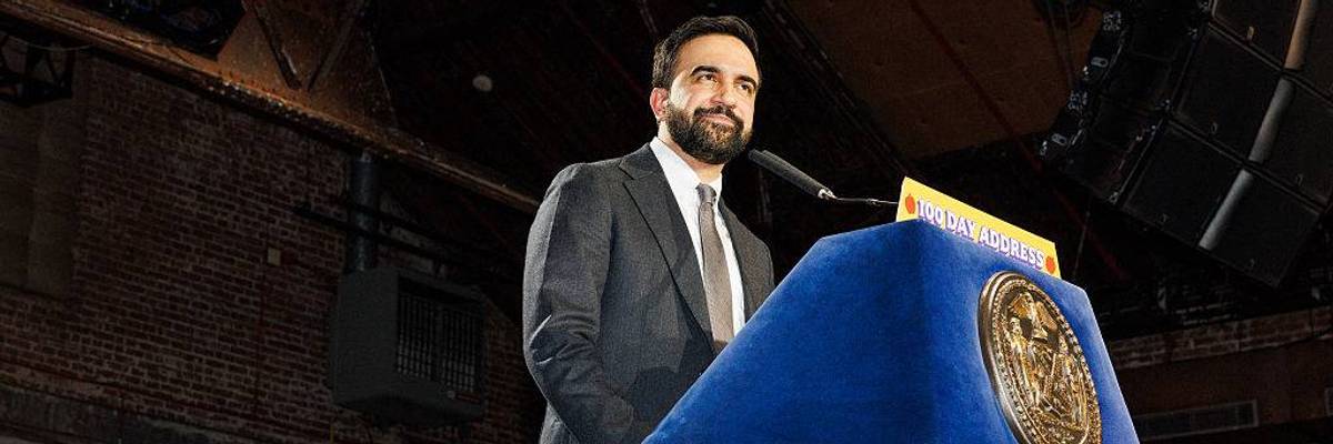 New York City Mayor Zohran Mamdani delivers an address to the crowd at his 100 Days Rally at the Knockdown Center in Queens on April 12, 2026.