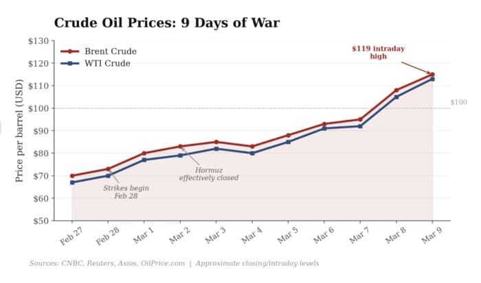 Brent was trading around $70 a barrel before the strikes. It touched $119 overnight.