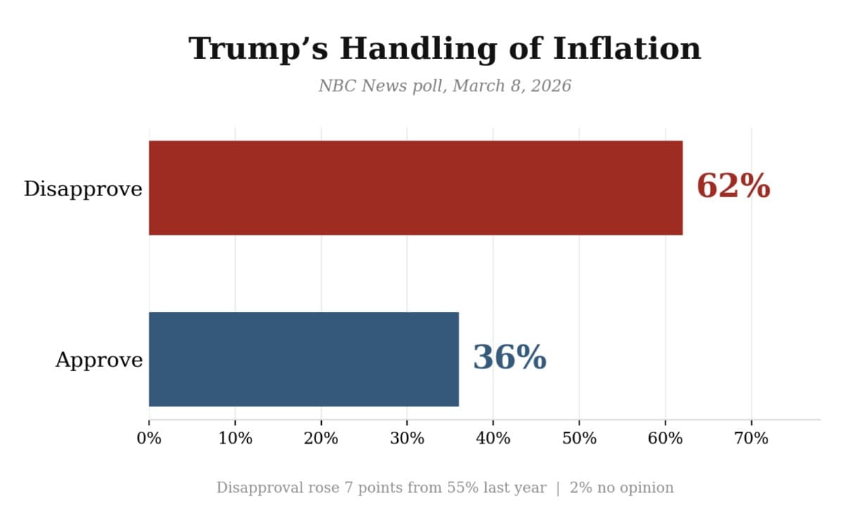 An NBC News poll released this weekend showed 62 percent of voters gave negative ratings to Trump’s handling of inflation—up 7 points from last year’s already-bad 55 percent. Nearly double the 36 percent who expressed support.