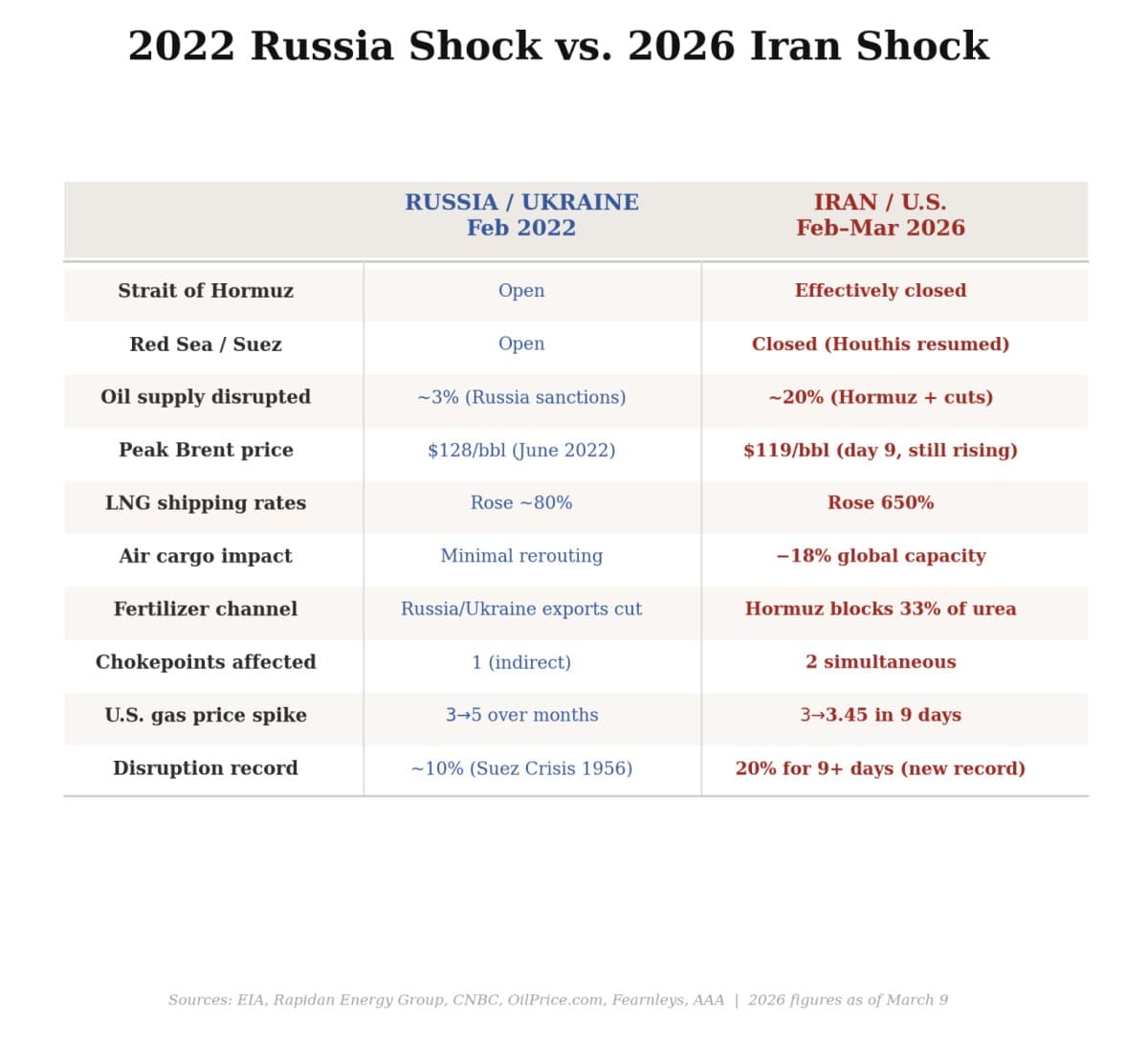 The difference is that in 2022, the Strait of Hormuz was open. The Red Sea was open. Container shipping was functioning. Air freight was flying. The global economy had shock absorbers. This time, we’re absorbing a shock that’s hitting every transmission channel simultaneously: energy, shipping, air cargo, insurance, fertilizer, financial markets, and trade policy. All at once.