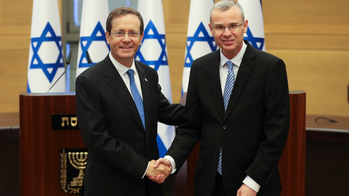Presidential candidate Isaac Herzog (left) shakes hands with Yariv Levin, Speaker of the Knesset, during a special session of the Knesset whereby Israeli lawmakers elect a new president, at the plenum in the Knesset, Israel's parliament, in Jerusalem on Wednesday. (Reuters)