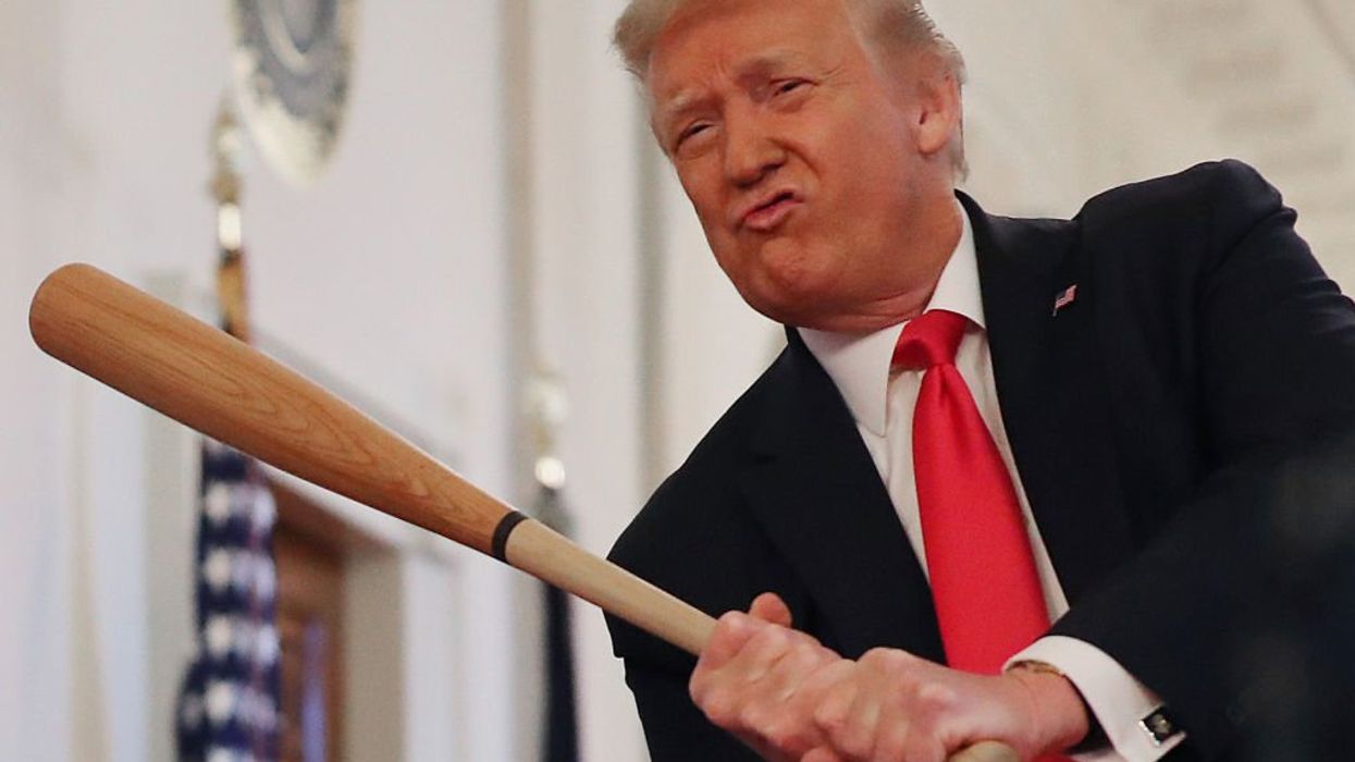 Donald Trump holds a baseball bat while looking at exhibits during a Spirit of America Showcase in the Entrance Hall of the White House July 02, 2020 in Washington, DC. (Photo by Chip Somodevilla/Getty Images)