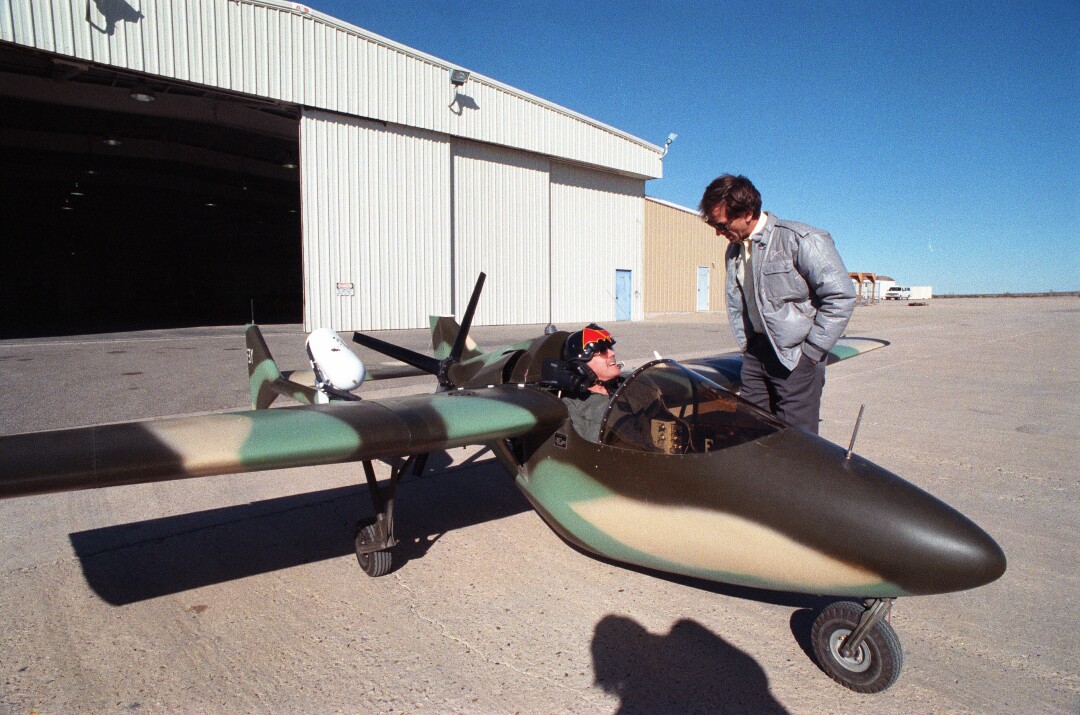 Linden Blue, co-founder of General Atomics, right, talks with Bill Sadler of Sadler Aircraft, who is in one of his light aircraft in 1988.