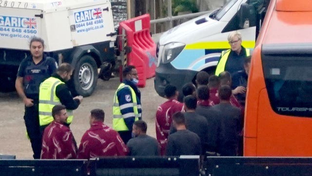 Migrants arrive into the Port of Dover onboard a Border Force vessel after being rescued while crossing the English Channel, in Dover