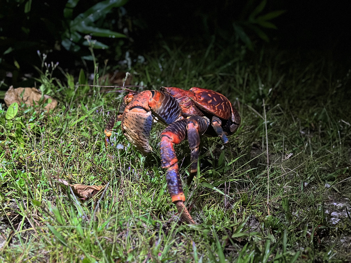 Palmyra Atoll is also home to the largest crab species in the world. Coconut crabs grow up to a meter wide and are prolific hunters and tree climbers. The science team has hypothesized that these land crabs are helping to distribute the symbiotic fungi to new roots through their digging, re-enforcing the cycling of nutrient among birds, crabs, coral reefs and native rainforest.