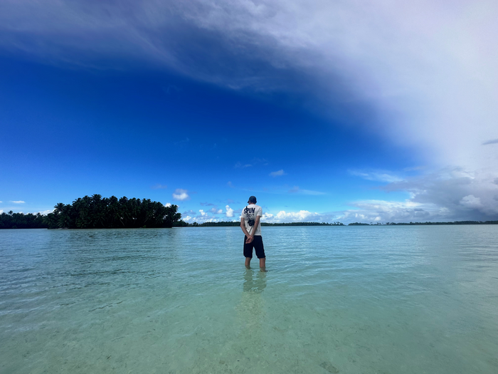 A SPUN researchers surveys the water near a sampling site on Palmyra Atoll.