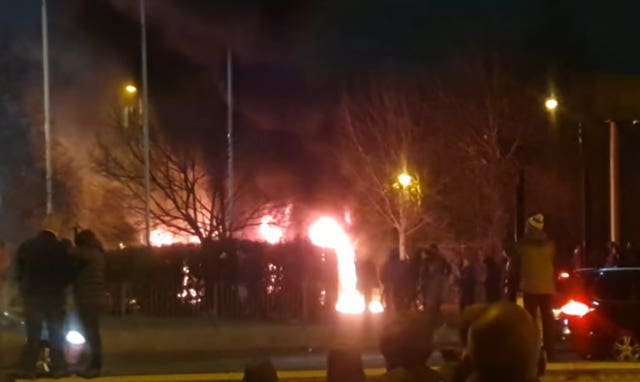 Fireworks were thrown at police, while a police van was attacked with hammers and set alight, during the disturbance on Friday 10 February.