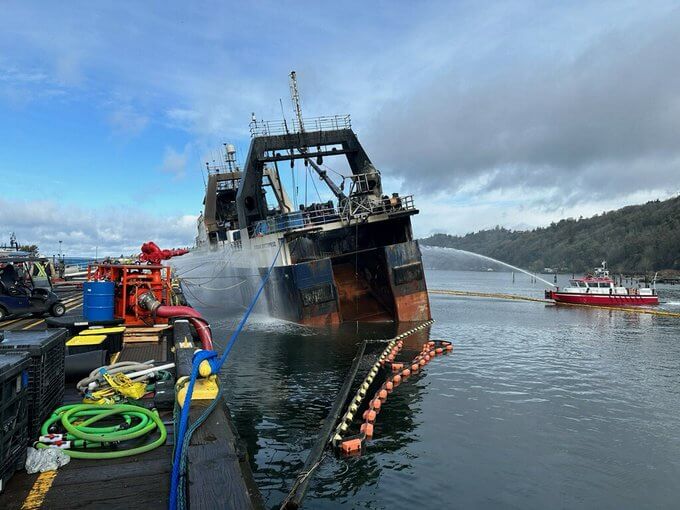 The fire aboard the catcher-processor vessel Kodiak Enterprisehas died down, according to the U.S. Coast Guard, but the response is not finished yet. The burned-out vessel is listing heavily to port, and responders are working to figure out where the source of the flooding is coming from.