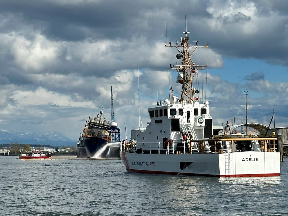 While the fire has subsided, the vessel has taken on a pronounced list to port, "more than we want it to," the response command told local King 5 News. Dewatering operations to correct the list and restore normal stability are under way, along with dive inspections to attempt to find the source of the flooding.