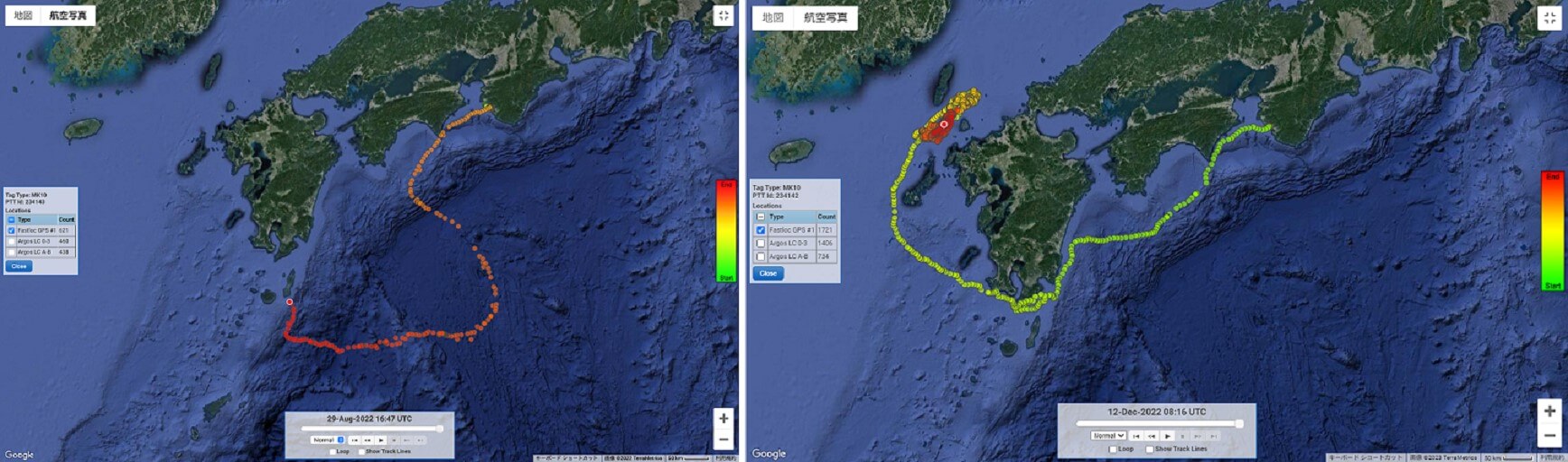 After spawning, "Hana-chan No. 4" headed west-southwest in a straight path toward Cape Muroto, and then made a clockwise half-circumnavigation of the Pacific Ocean on the southeast side of western Japan until the transmission was interrupted 10 kilometers offshore south of Tanegashima. On the other hand, "Umi-chan No. 4" typically remained somewhat near the shore. The NYK Group will continue to actively engage in environmental conservation efforts, including activities to preserve the marine environment and biodiversity.