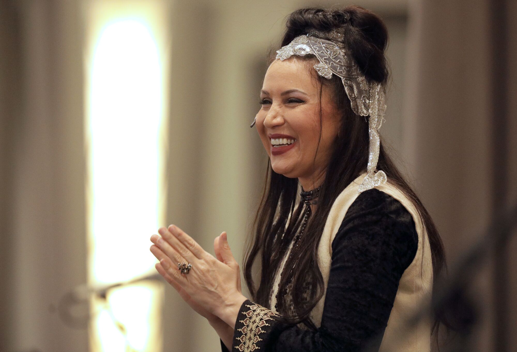In a lavish West Hollywood banquet hall adorned with the colors of spring, the Iranian epic storyteller Gordafarid strides across the stage like a mythical heroine, dressed in a white embroidered vest, black bell sleeves and white knee-high boots. A silver beaded scarf is arranged like a crown on top of her long, dark hair.