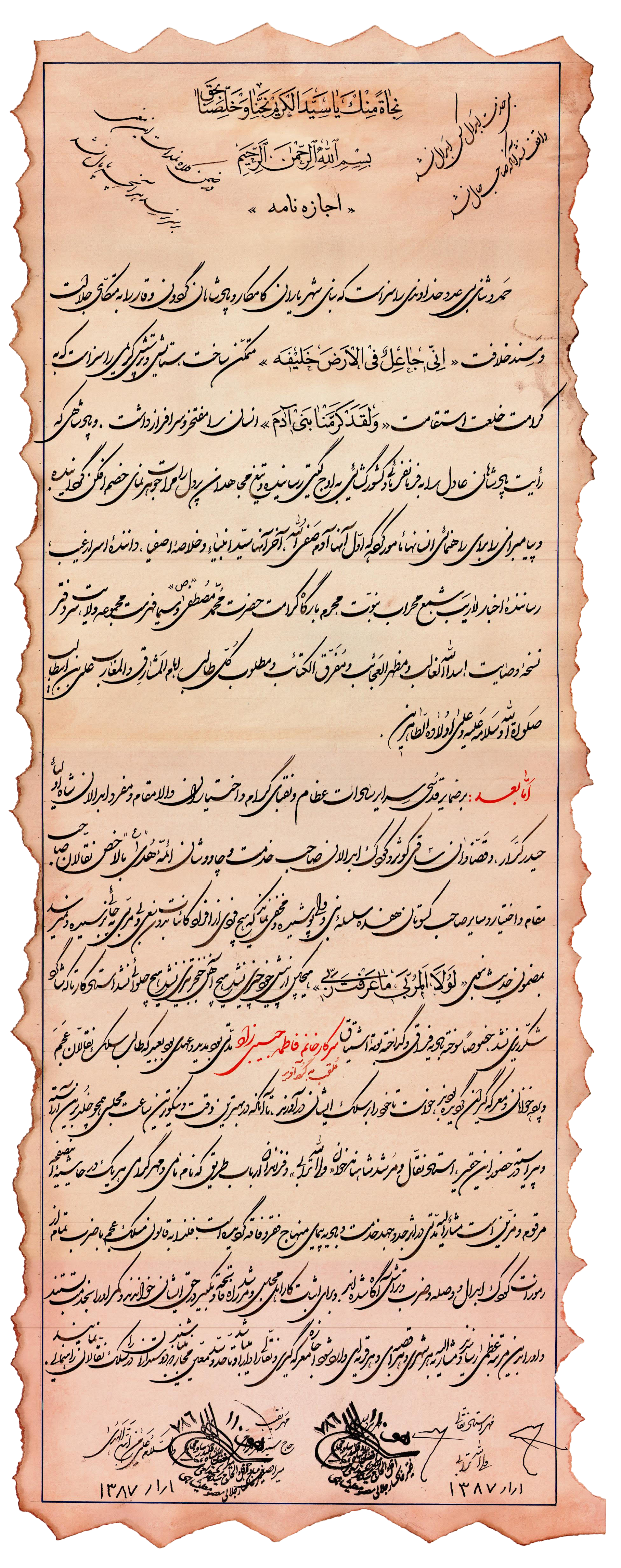 A certificate signed by four famous Naqqals declares Gordafarid the first female Naqqal in history.