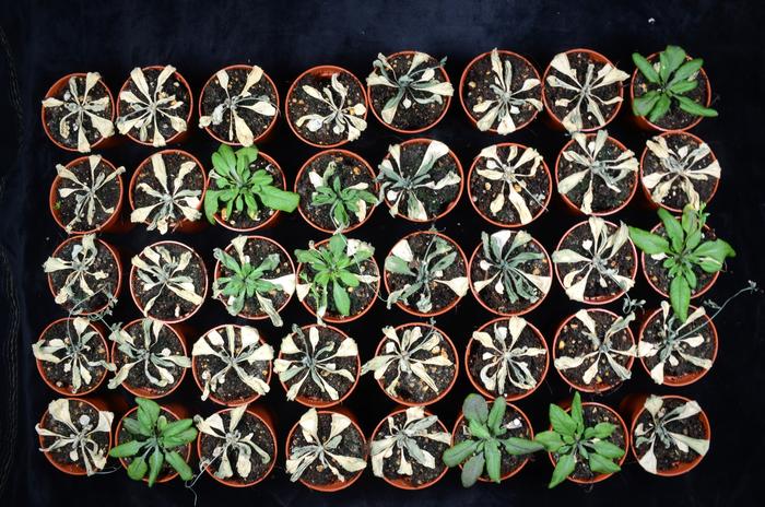 Example of one of the experiments, where several Arabidopsis thaliana plants have been grown in water scarcity conditions (Credit: CRAG).