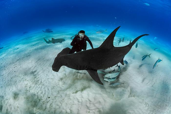 His Excellency Abdulmohsen Abdulmalik Al-Sheikh dives with an Endangered hammerhead shark.