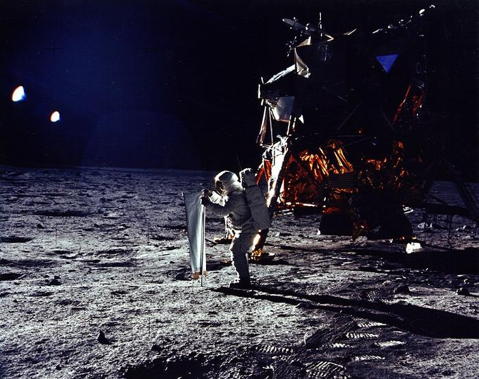 U.S. astronaut Buzz Aldrin erects solar wind experiment.