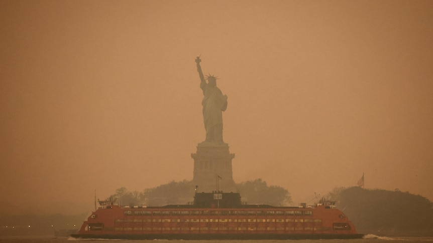 The Statue of Liberty was covered in haze and smoke caused by wildfires in Canada.(REUTERS: Amr Alfiky)