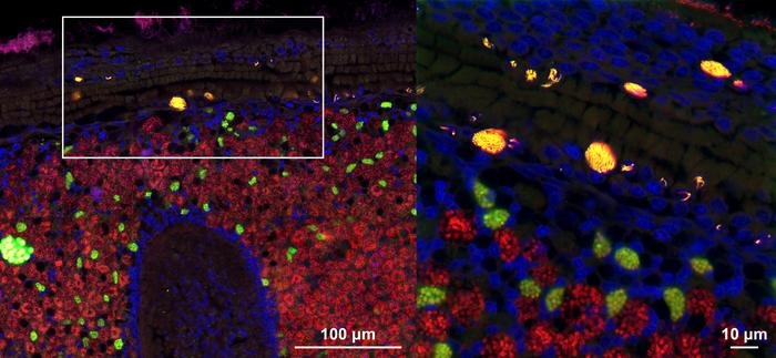 Microscopy image (fluorescence in situ hybridization (FISH) confocal microscopy) of tissues from a deep-sea mussel showing the intranuclear parasite Ca. Endonucleobacter in yellow, and the beneficial symbiotic bacteria in green and red. Cell nuclei are stained blue. The right panel is a zoom-in of the white square in the left panel.