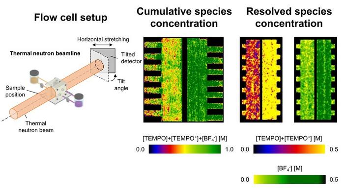 “Using this fundamental property of neutrons interacting with certain molecules, we are using neutron radiography for the first time to look at concentrations of molecules in flow batteries.” A new application of existing science, in other words. “That technique itself is not new; it is already used by museums, for example, to see what historical objects are made of without damaging them. But now we can also use it to visualize moving fluids, as in redox flow batteries.”