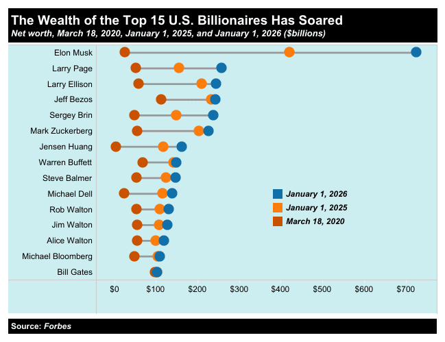 On March 18, 2020, for example, Elon Musk had wealth valued just under $25 billion. A little over five years at the end of 2025, Musk’s wealth is $726 billion, a dizzying 2,800% increase from before the onset of the pandemic.